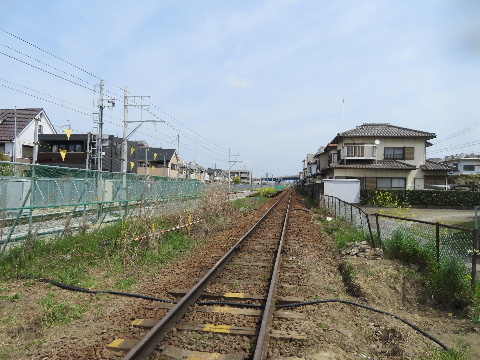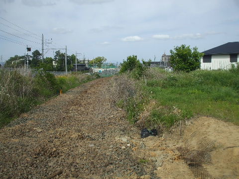 | 2023年05月05日。八橋方向旧線。バラストだけ残る。 | 2023年05月05日。若林方向。こちらも同様。 |
