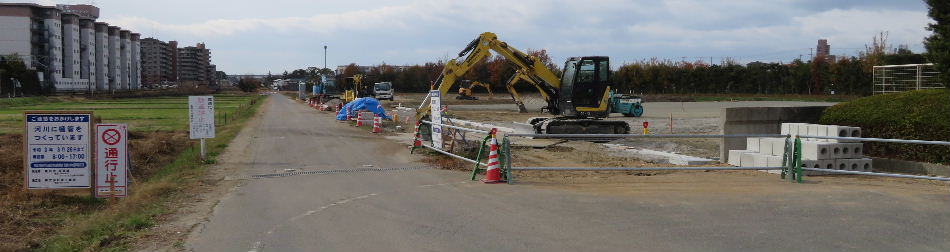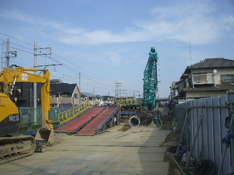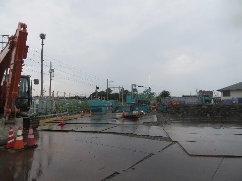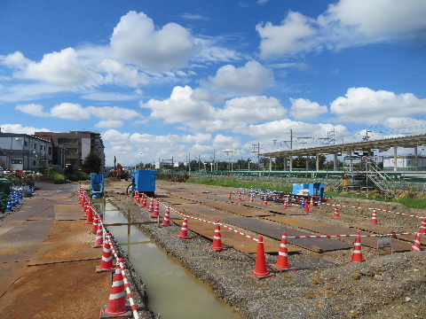 | 2023年10月01日。若林方向。鉄板の上に重機。 | 2023年11月05日。八橋方向。重機等が入って向こうが 見えない。 |