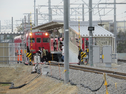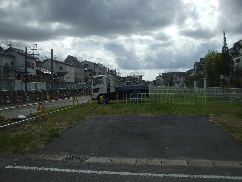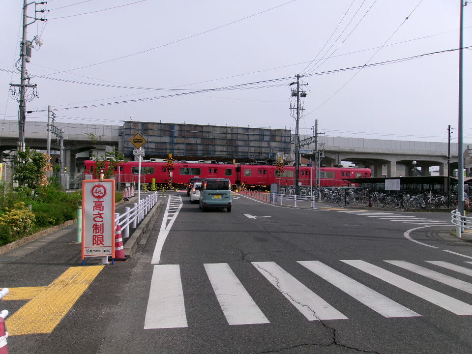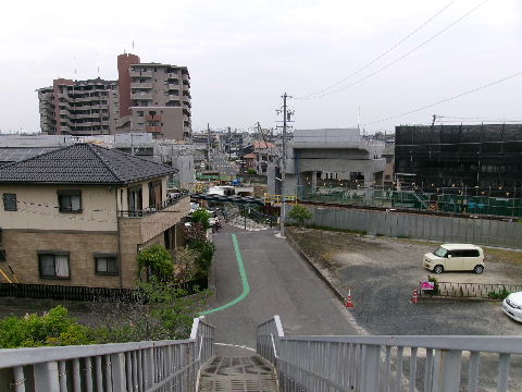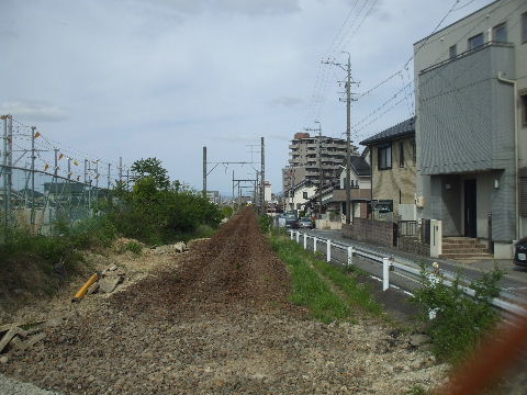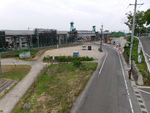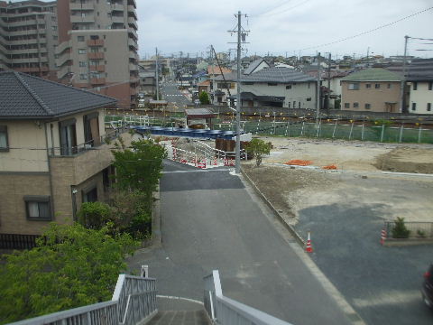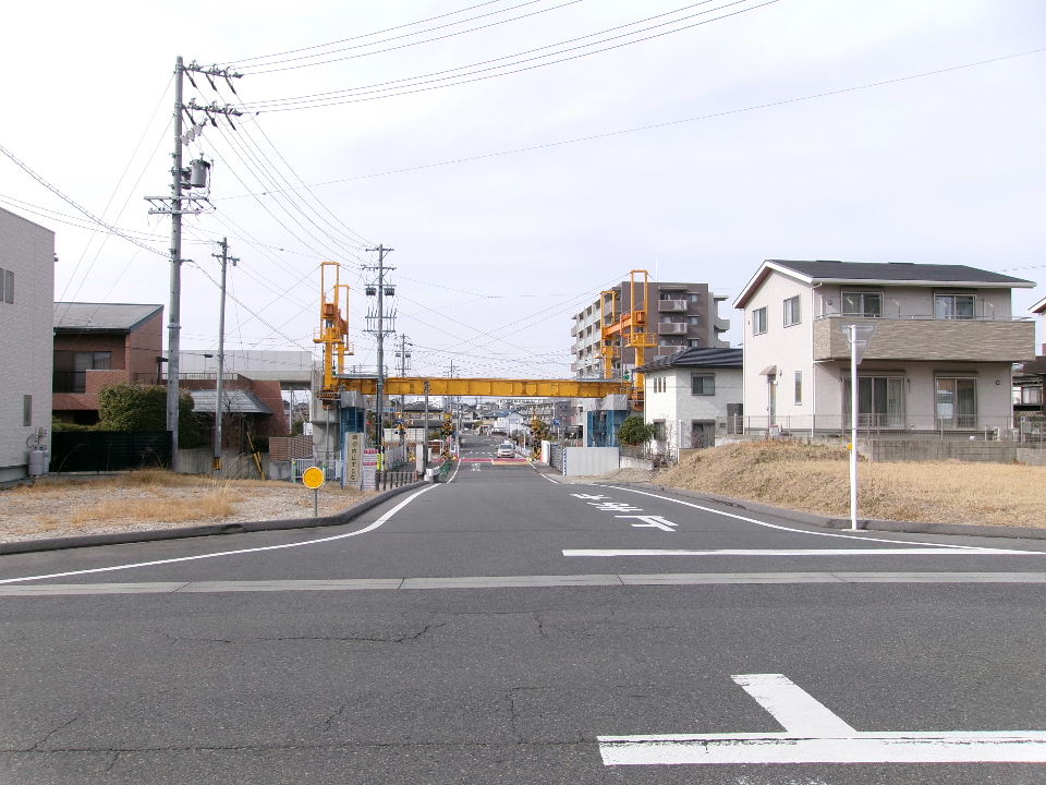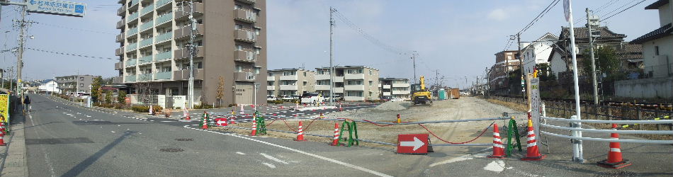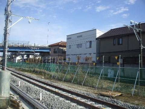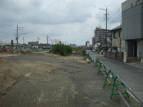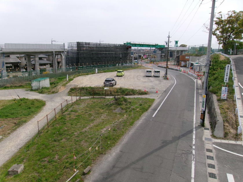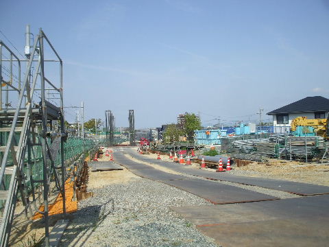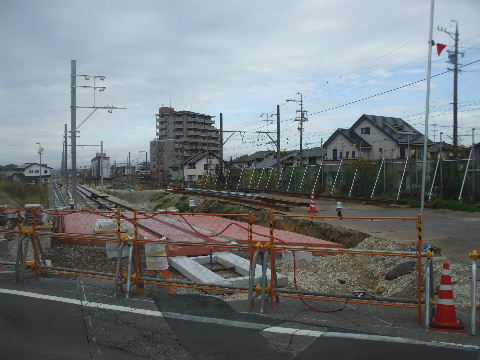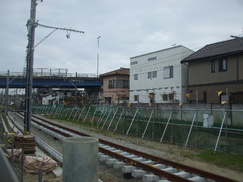 | 2021年04月11日。道路通行止めになって仮線用地確保。 道路に面した家は撤去されているので仮道路は無し。 |