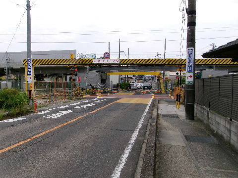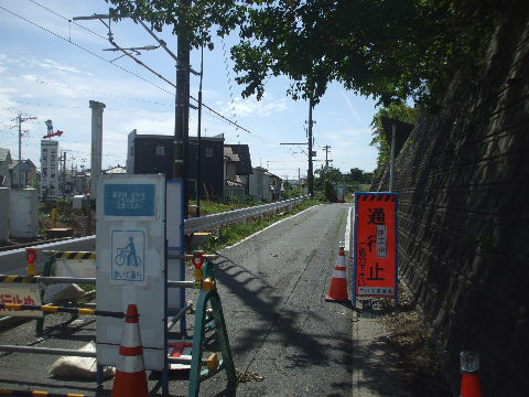 2021年08月22日。中根の踏切へ下りていくところでも仮線 用地工事行われ車両通行止めになっている。 |