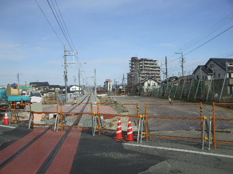 | 2023年01月22日。竹村方向。あとは架線。 | 2023年03月05日。この踏切だけ既に旧線線路が 撤去されている。 |