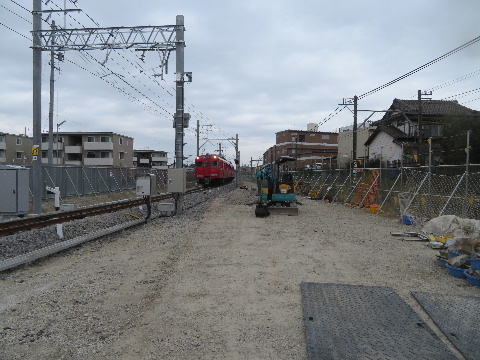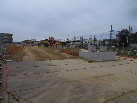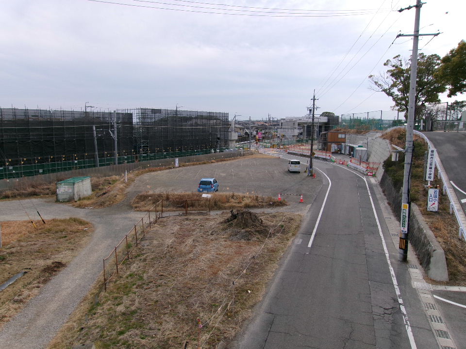 2022年03月06日。竹村方向。歩行者通路の位置も変わり 少しずつ仮線用地の輪郭が出来てきた。 |