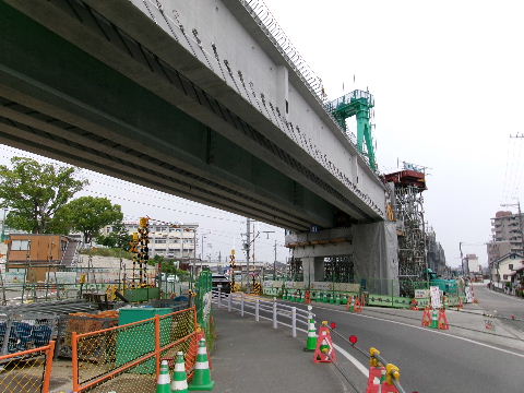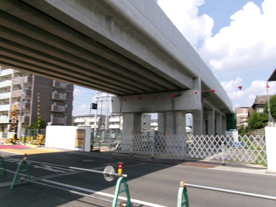 | 2021年04月11日。高速下から若林方向を見る。高架橋から 少し離れた位置に新しい道路が出来て仮線用地確保。 |