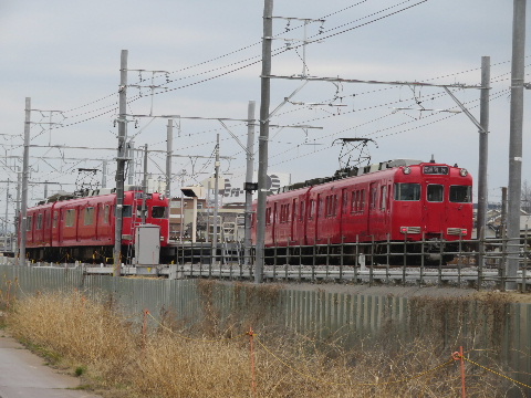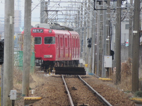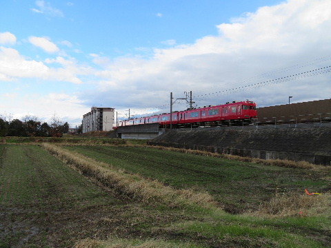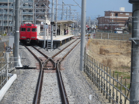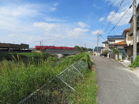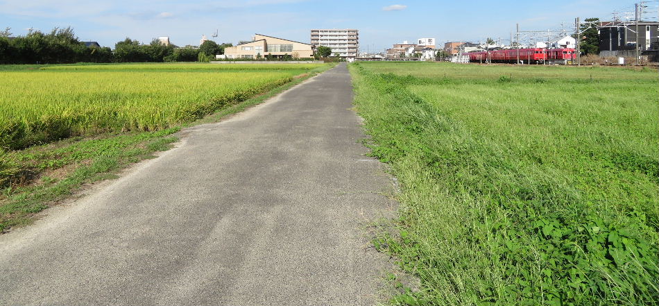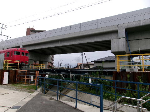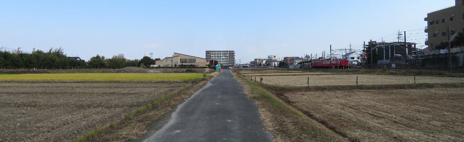 | 2011年07月11日。三河八橋駅の高架橋から降りてきたところ。 | 2016年12月23日。複線幅コンクリート高架橋が少し下ったと ころから単線幅土盛りになり地平に下りてくる。 |