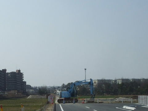 | 2022年04月23日。地平に下りてくるところには盛土の準備。 | 2022年04月23日。もう少し若林寄りでは側溝と路盤づくり。 |