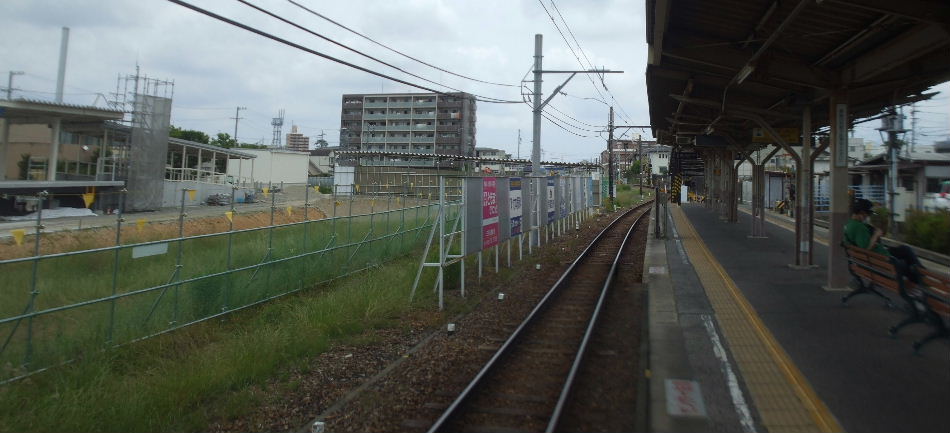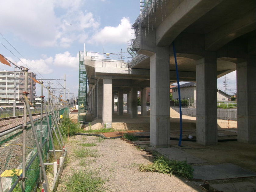 | 2025年08月17日。八橋方の下り副本線分岐部。 駅部の高架橋から鉄筋が飛び出ているので下り 副本線は仮線撤去後の工事になるか。 |