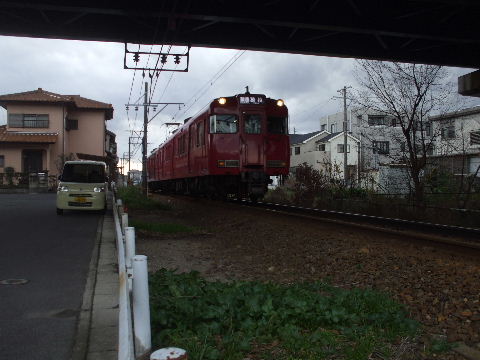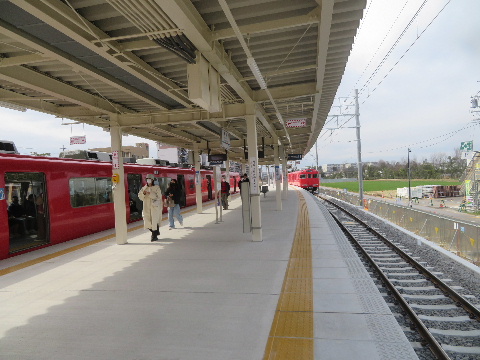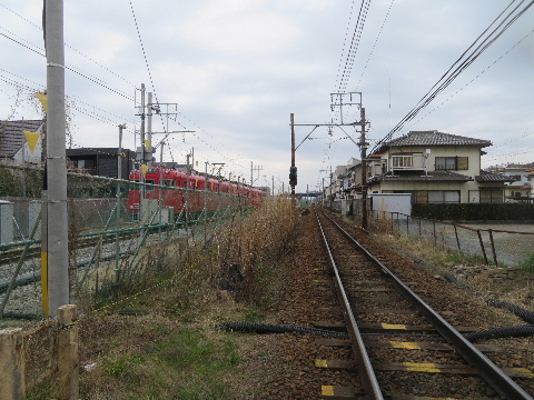 | 2023年03月05日。仮線を走る電車を旧線上で停車して待つ。 | 2023年03月05日。旧線上から若林駅方向を見る。 |