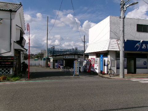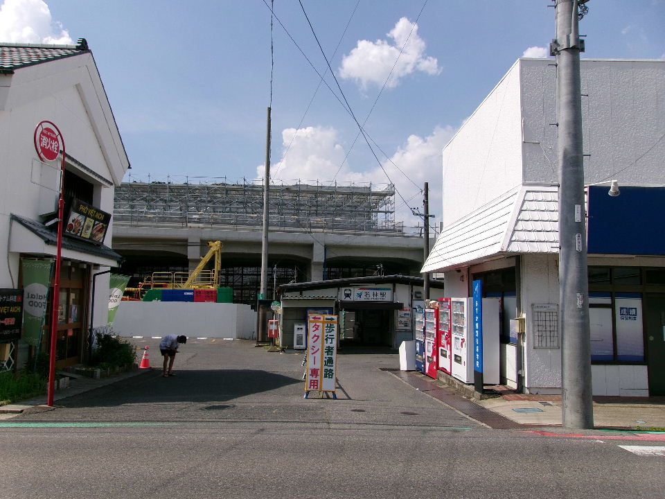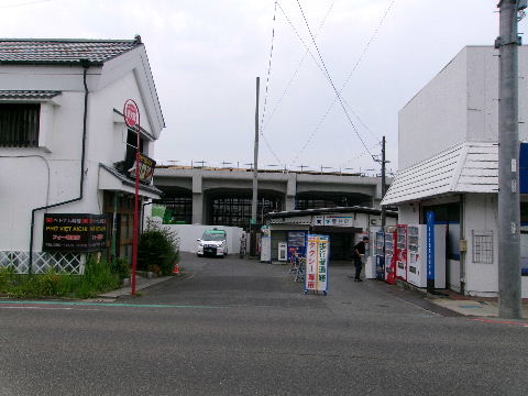 | 2025年06月08日。駅部幅広の高架橋下。 | 2025年06月08日。駅舎の奥に高架橋。その上には ホームの出っ張りが見える。 |