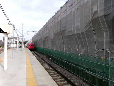 | 2025年02月16日。ホームから八橋方向。 | 2025年02月16日。ホームから竹村方向。駅部 全体を足場シートで囲って高架橋作り中。 |