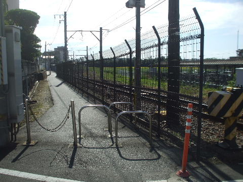 | 2020年09月19日。南から見る。すでに道路を作る用に空いている。 | 2020年09月19日。若林駅方向を見る。線路沿いが駅から駐 輪場への通路になっているが急いで線路上を近道とかせん ようにしっかりりフェンスが張ってある。 |