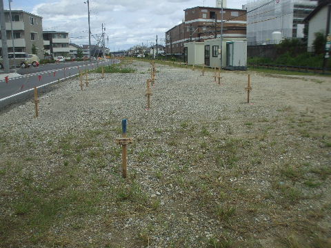 | 2021年08月22日。仮線用地の線路を敷くところに印の棒杭。 今の狭い1面2線から2面4線になりホーム幅も多少は広く なるだろうからその分の用地を避けるために仮駅前後で 結構カーブするようだ。 |