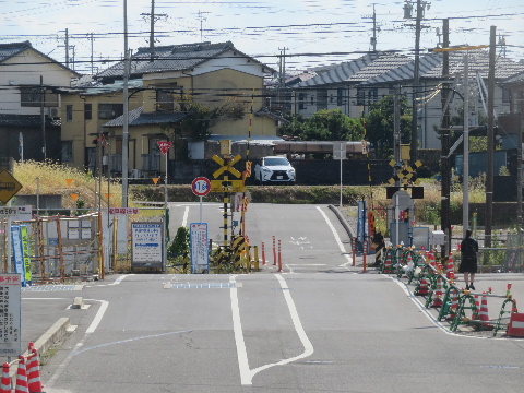 | 2022年10月23日。竹村駅方向。こちらも同様。 | 2022年10月23日。仮線踏切部できる。線路があるので 車はつい手前に停まってしまう。 |