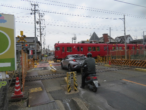 | 2022年01月30日。反対から見る。奥まで広い道路に なったが踏切は元の車一台が通れるくらいの狭いまま。 手前にできる仮線の踏切に変わったら広がるか。 |