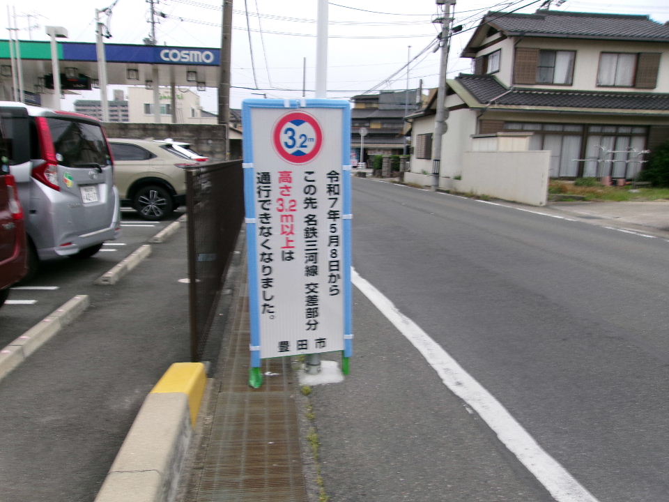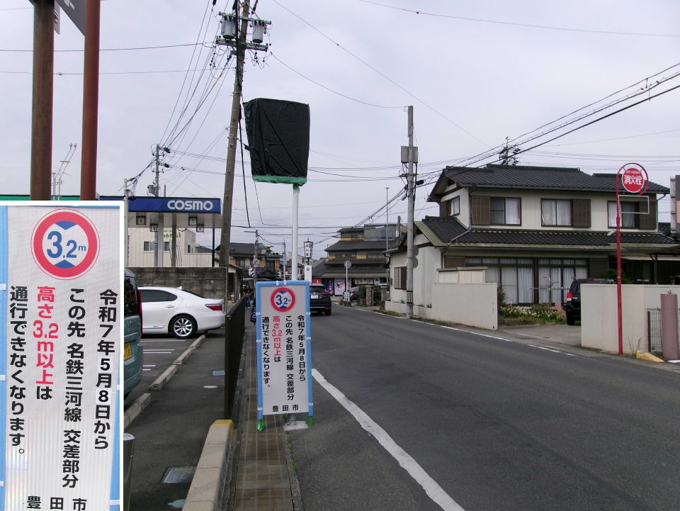 | 2025年04月20日。踏切脇に準備。 | 2025年04月20日。前後の道路には既に高さ制限の 交通標識が設置されている。 |