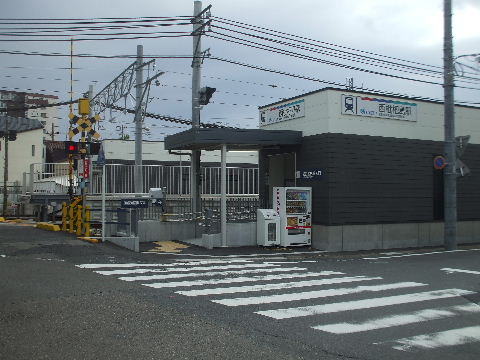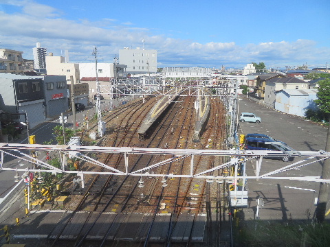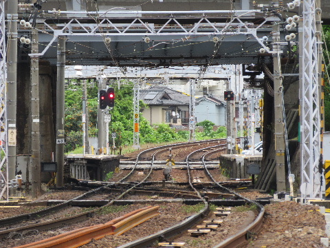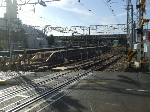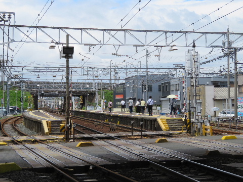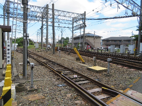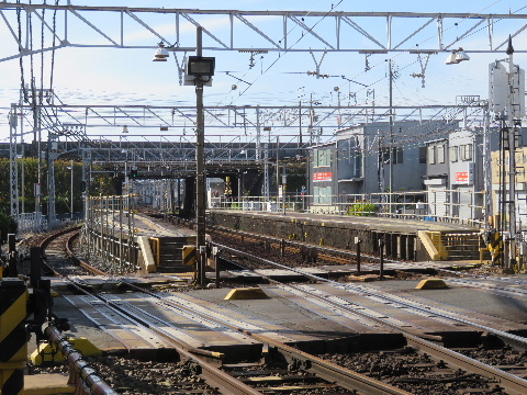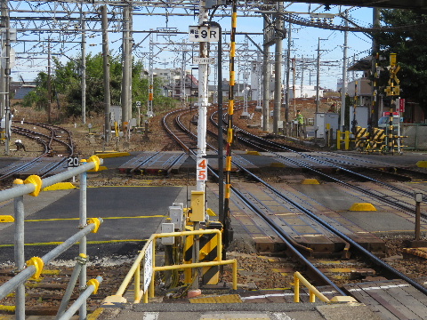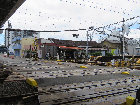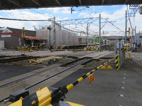 | 2019年06月08日。駅東側の踏切。上下本線、 副本線と側線の5線並んでいる。副本線と側線が 無くなると本線の2線だけになる。将来的には 右上の陸橋が4車線の新しい橋に架け替えられる ので踏切自体なくなるかも。 |