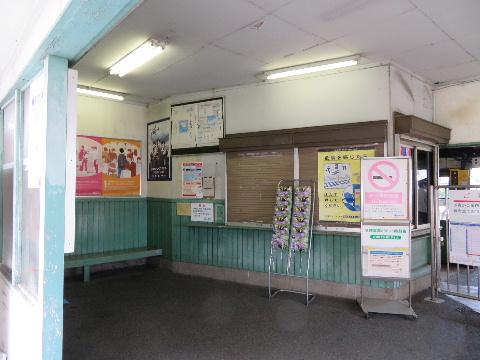 | 2019年06月08日。駅舎内。塞がっている元出札口と 古典的なベンチ(待合室)。 |