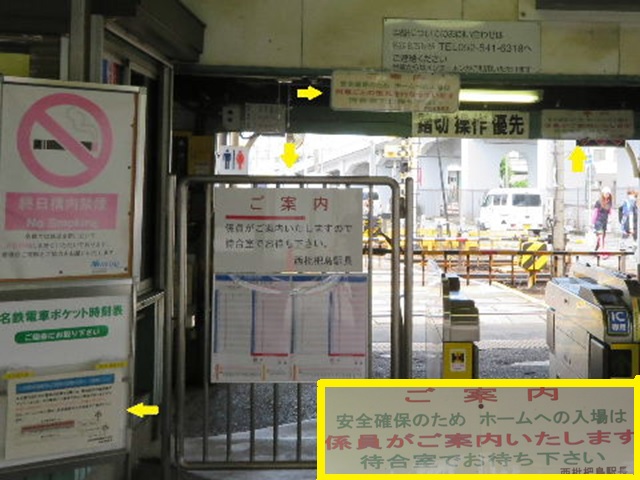 | 2019年06月08日。ホームが狭くて危ないので 電車が来る時間までホームには入れない。 改札口周りには画像右下のようなその旨表示が 4ヵ所も。 |