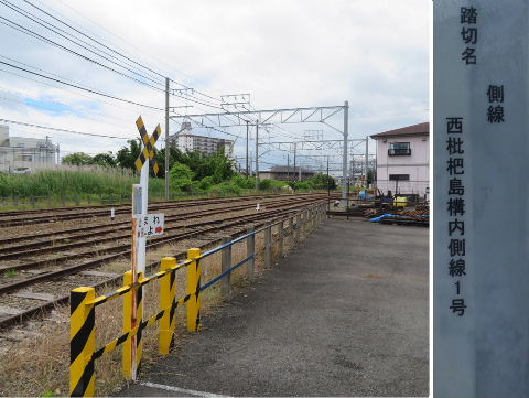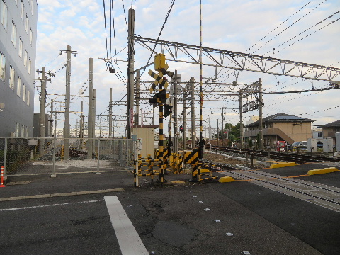 2019年06月08日。東海道線土手下にある駅西側の 踏切。こちらは副本線が分岐するところに踏切がある。 |