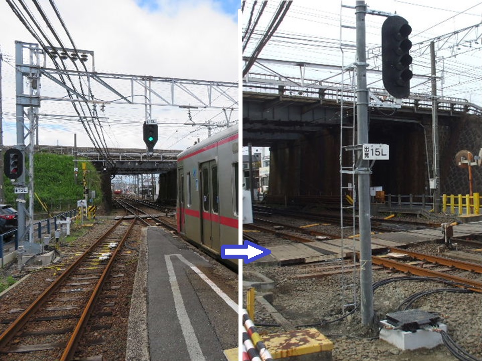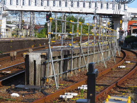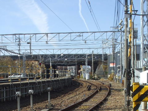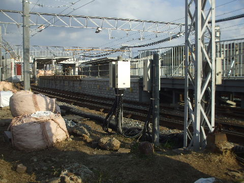 | 2020年01月25日。ホーム端の架線柱に副本線の、 ビームからぶら下がって本線の出発信号機が あったが副本線跡に柱を立てて新しく本線だけの 出発信号機が設置された。 |
