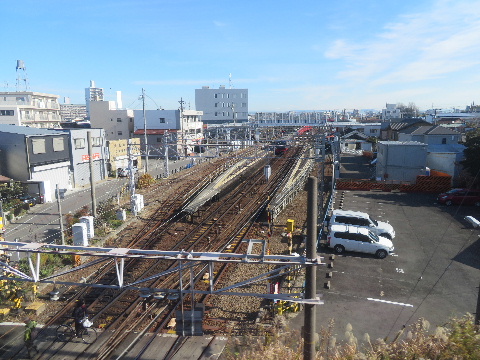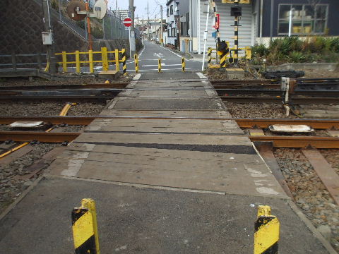 | 2020年01月19日。陸橋下の踏切。駅に近い側の 車道を横切る副本線線路撤去され5線から上下 本線と犬山線につながる線の3線に減る。 |