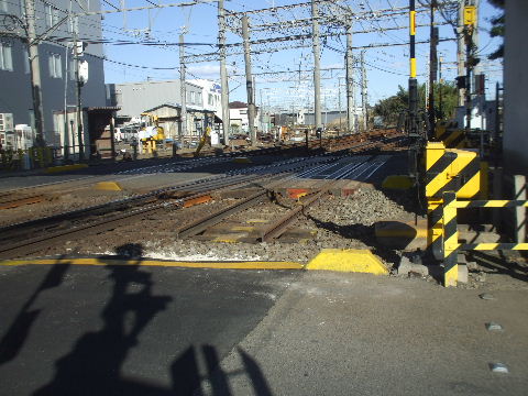 | 2024年10月27日。東側の踏切から見る。踏切板を 撤去したところのバラストがまだグレー色。 |