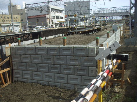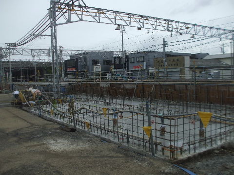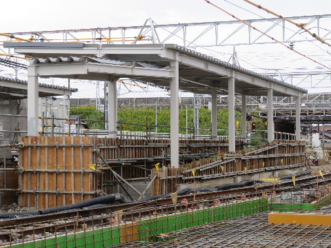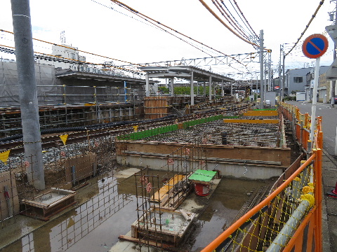 2020年09月27日。連絡線の外側でも基礎工事。 これも駅舎と思われるので本線を渡る構内踏切は なくなるが連絡線を渡る構内踏切が新たに出来るか。 |