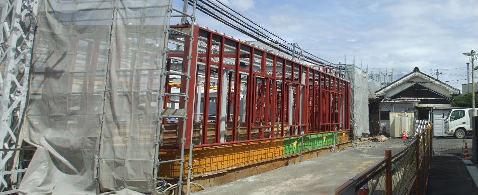 2020年09月12日。下りホーム側、駅舎とホーム 屋根の建設中。 |