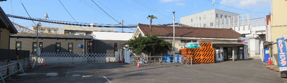 | 2020年01月11日。名古屋寄りから見る。 | 2020年01月11日。横の駐車場だったところの 駅舎寄りが工事事務所と作業用スペースに。 |