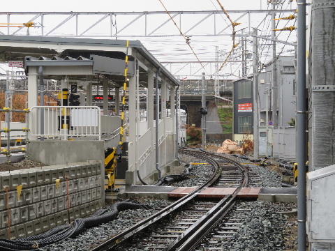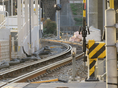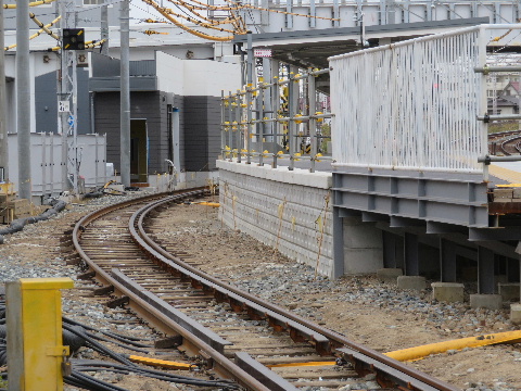 | 2020年11月15日。上りホームはまだ土手作り中。 | 2020年11月29日。犬山線につながる線には新たに 補助レールが取り付けられたのでホームとあって いないカーブはこのままのようだ。 |