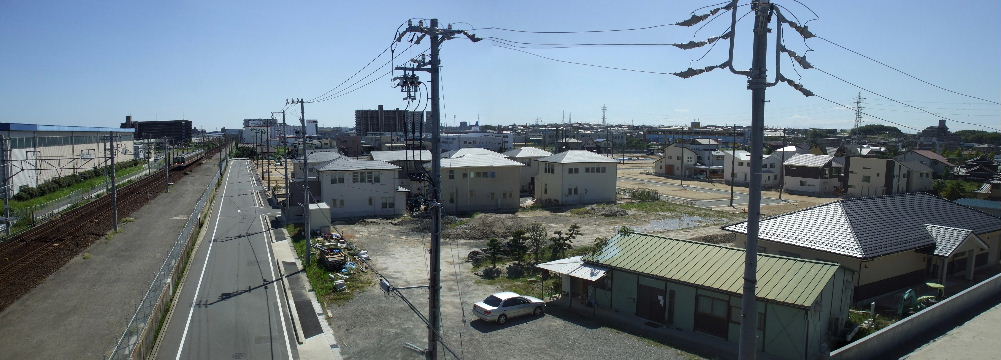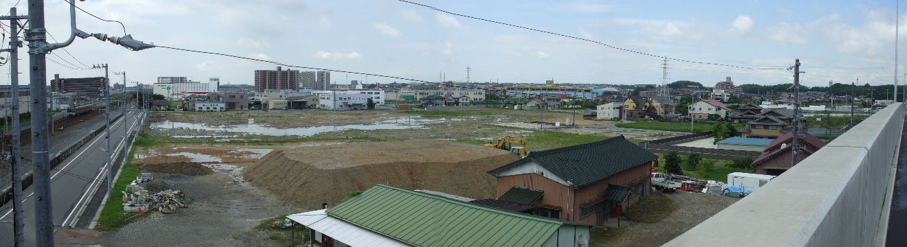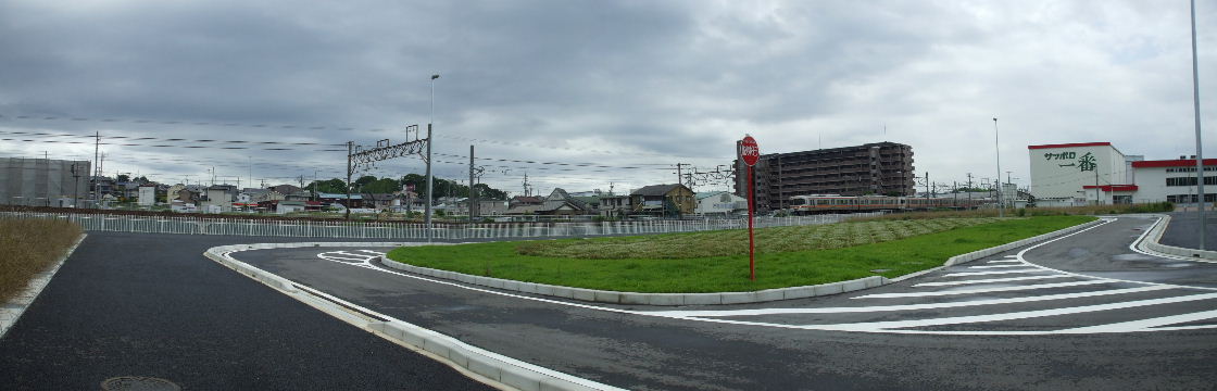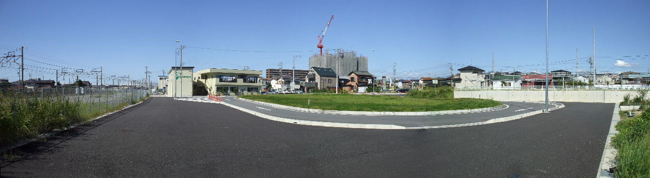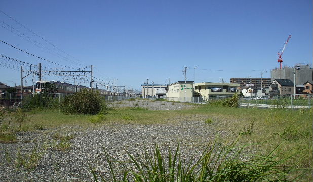周辺では区画整理が進んで建物もかなり増えてきているがまだ隙間が多い。線路の横の空いている土地は元・南方貨物線の予定地