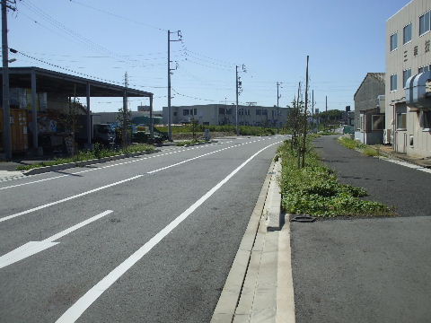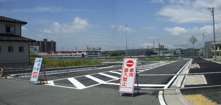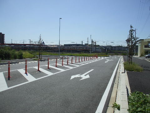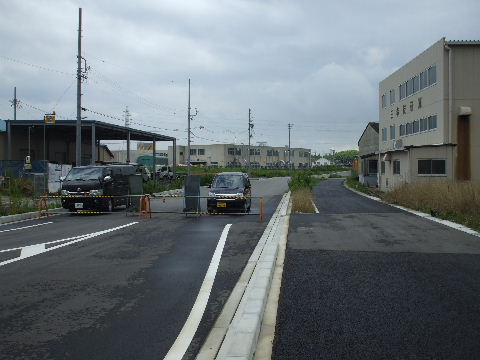 | 2010年7月4日。駅前広場へ出入りする道路。西を見ると道路はすぐ途切れ、見ての通りその先はまだ本舗装もされておらず駐車場代わりに使われ、少し行くと行き止まりになる。