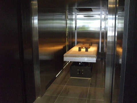 | そしてここへ押し込むが火葬炉はさらに奥にある。 | 火葬には1時間くらいかかるらしいのでその間2階のここで待ち合
