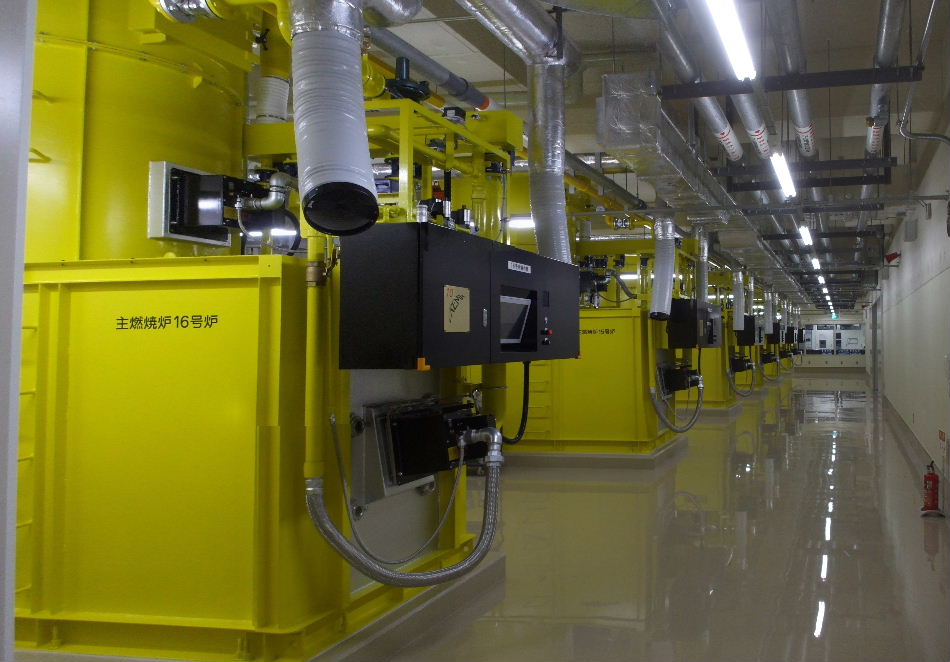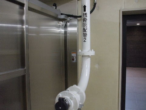 | 黄色いのが火葬炉。左の銀色の所は高温で火葬した後の骨やら何や らの熱を冷ます所。 |