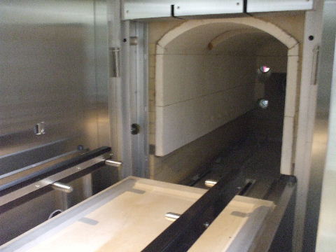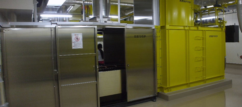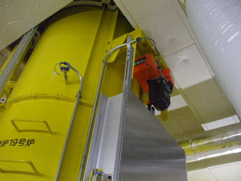 | 火葬炉の扉。扉を吊っているホイストが250㌔用で、高温を遮断す