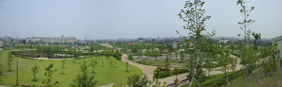 | 丘から北を見る。公園の向こうに南陽小学校や区画整理中でこれか ら家が立つ所が見える。 |