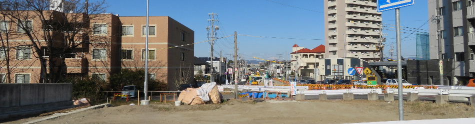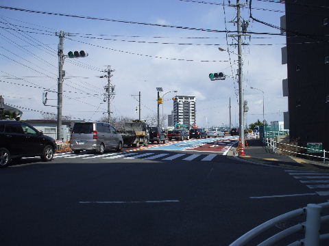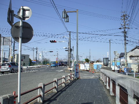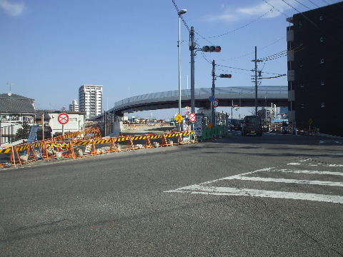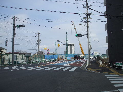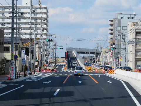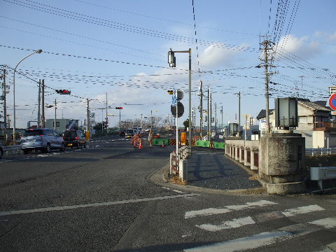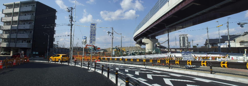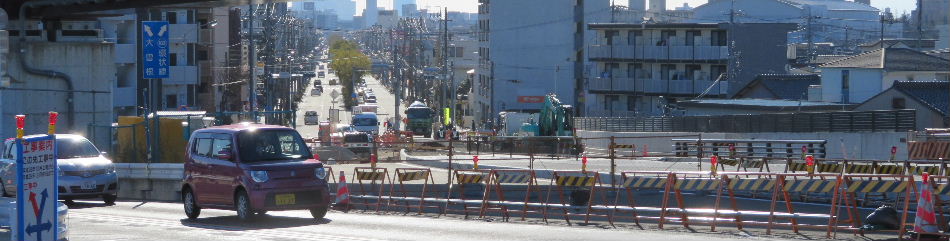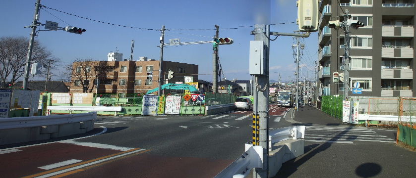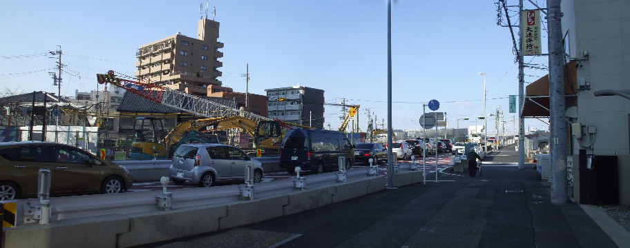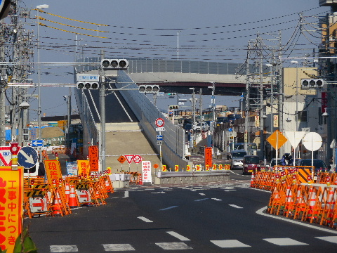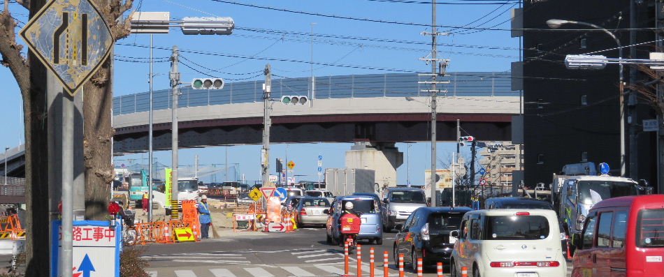 2016年03月12日。すぐ北の次の交差点ー神守交差点ーで立体交 差工事中。折角立体交差で三階橋を渡ってきたのにこの交差点信 号で引っかかって渋滞していては意味がないから。 |