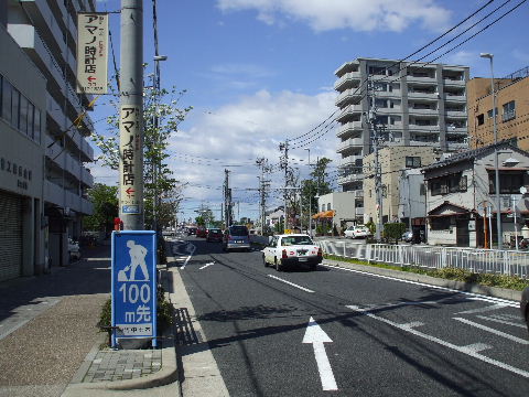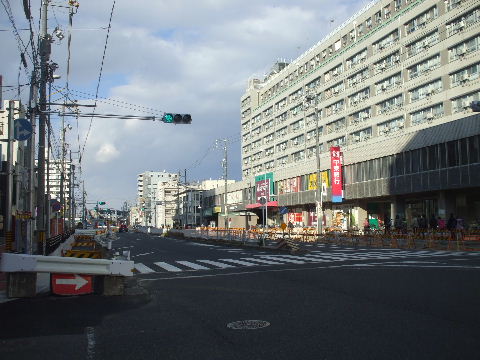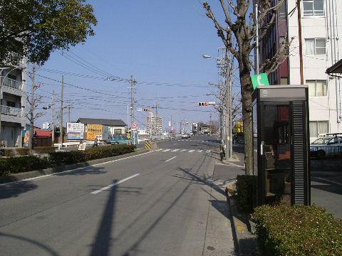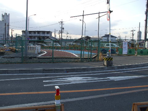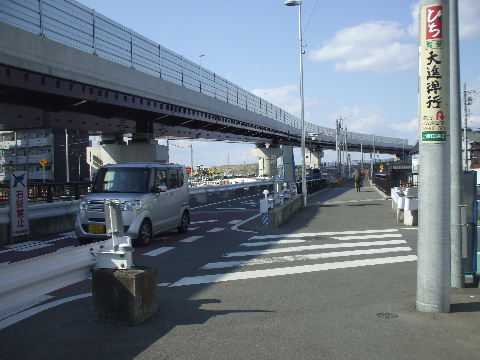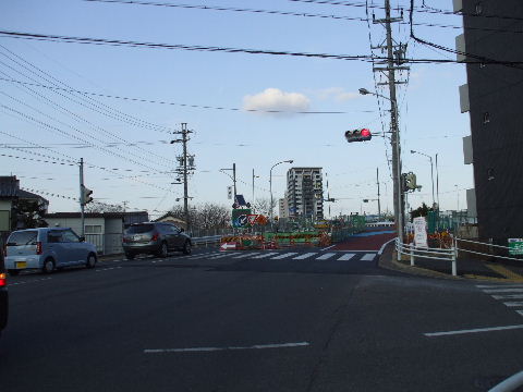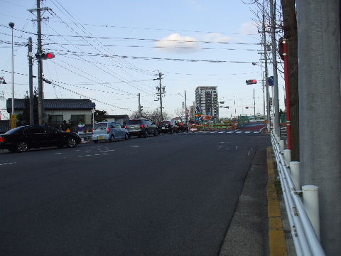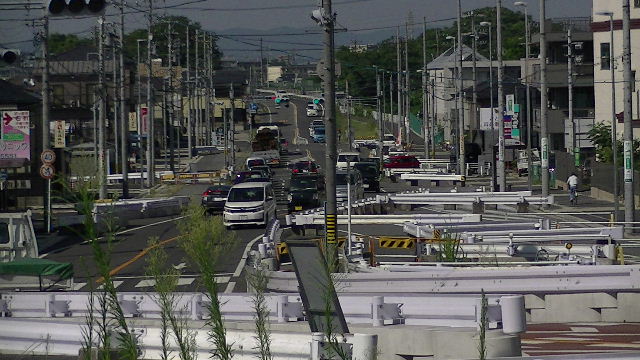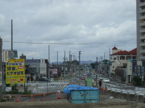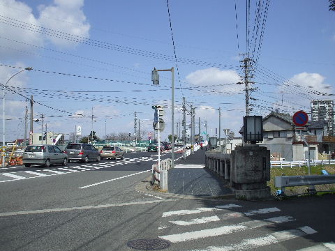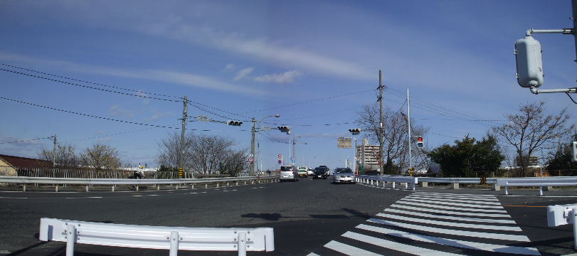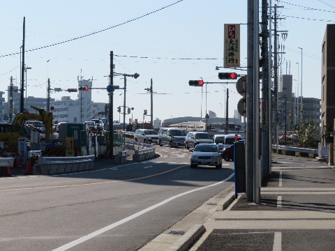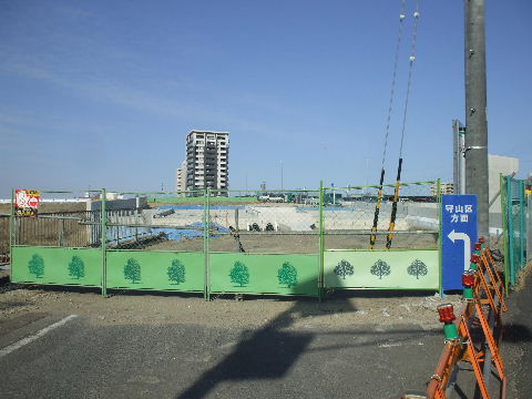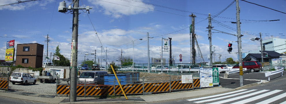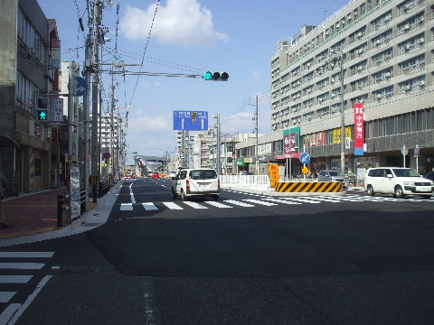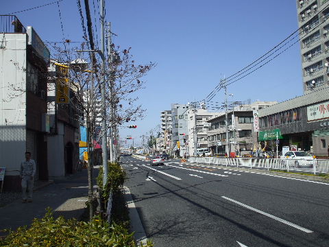 2016年03月12日。すぐ北の次の交差点ー神守交差点ーで立体交 差工事中。折角立体交差で三階橋を渡ってきたのにこの交差点信 号で引っかかって渋滞していては意味がないから。 |
