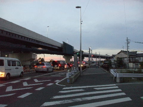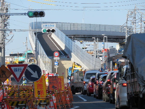 | 2017年02月04日。黒川方向から橋につながる部分を建設中。右カーブして上飯田方向からの道に合流しているこの渋滞も橋が完成すればまっすぐ進んで上飯田方向からの車が無くなるのでしゅっと通り抜けられるようになる。 |