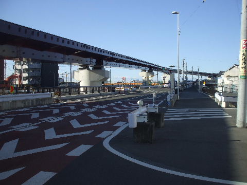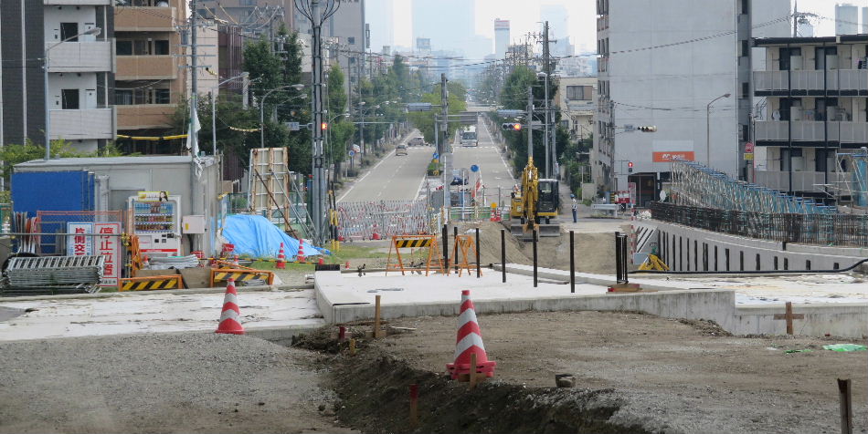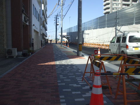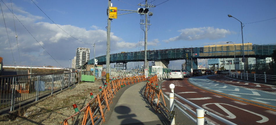 2017年12月24日。高架下の工事が終わって車線が中央寄りに移り 歩道寄りの方で整備工事が行われている。 |