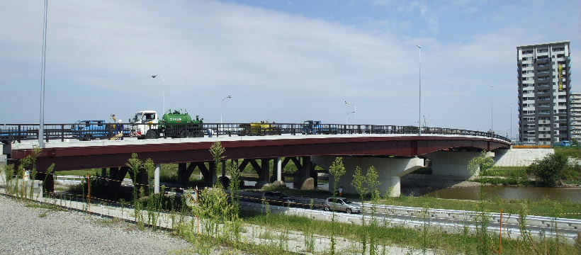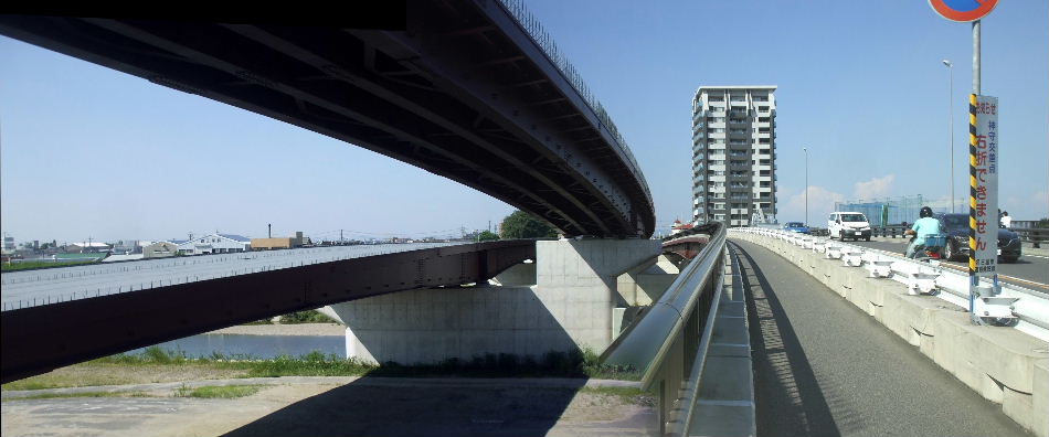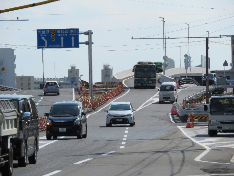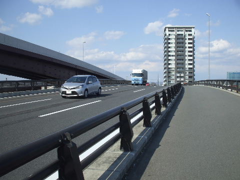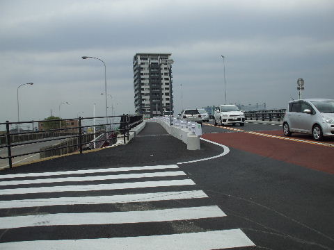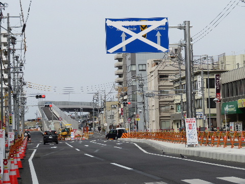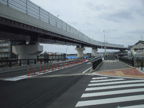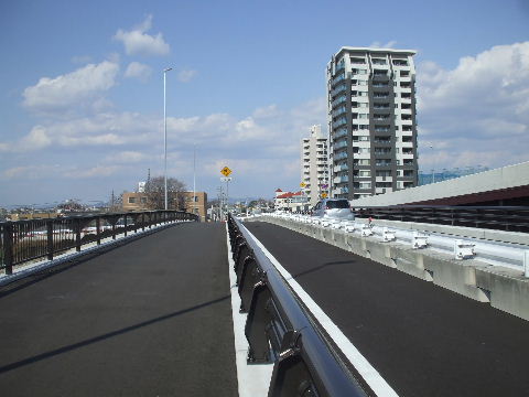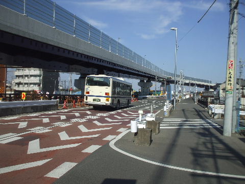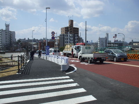 2017年03月28日。新しく出来た北行きの橋は橋の北がまだ工事中 だからかガードレールで仕切って一車線だけの使用。 |