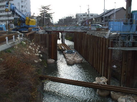 2016年01月10日。庄内川上に架けた橋との境目にはまだ隙間。 |