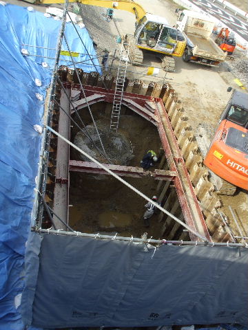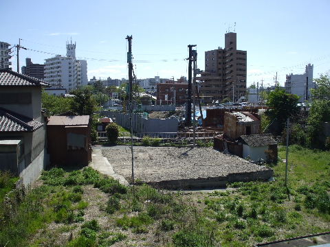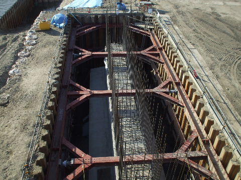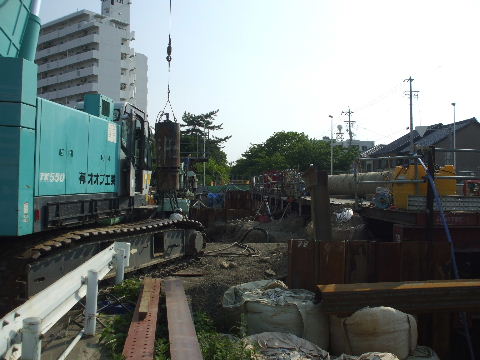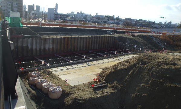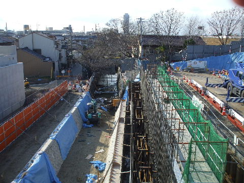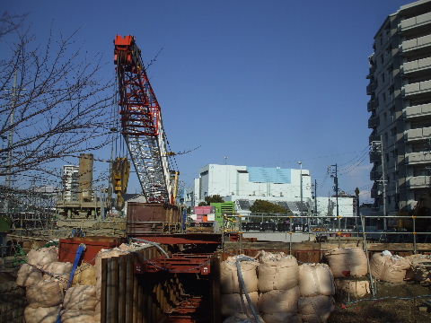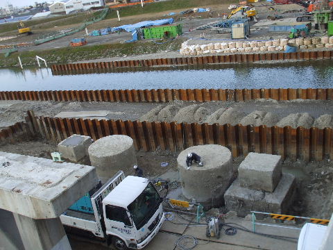 | 2012年1月28日。矢板で囲って橋脚基礎撤去中。歯茎に残った虫歯の根が並んでいるような。 |