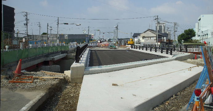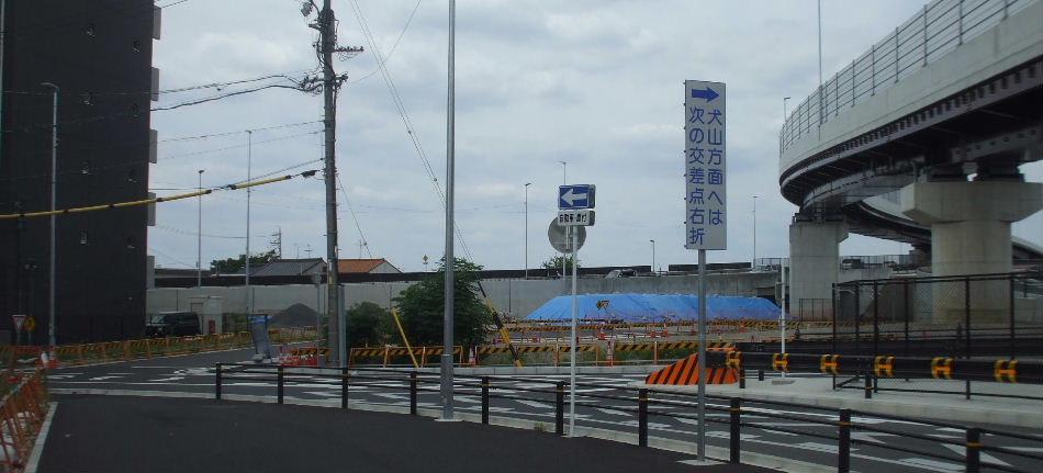 | 2012年9月29日。上の画像と同じ位置。右の上飯田からの道路に並んで用水上に黒川方向への道路建設中。手前の橋脚は上飯田からの立体交差用。 |