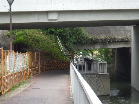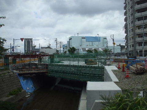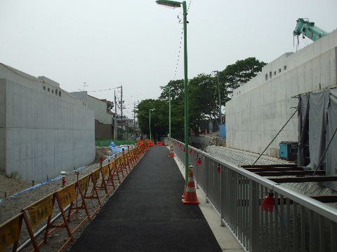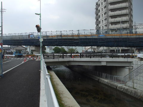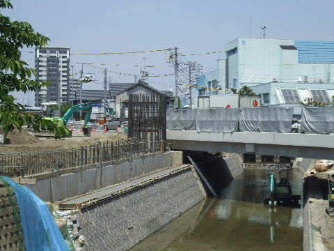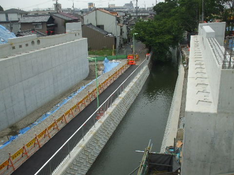 2012年6月2日。用水沿いの歩道も通れるようになり橋予定地の下を通り抜けられる。 |