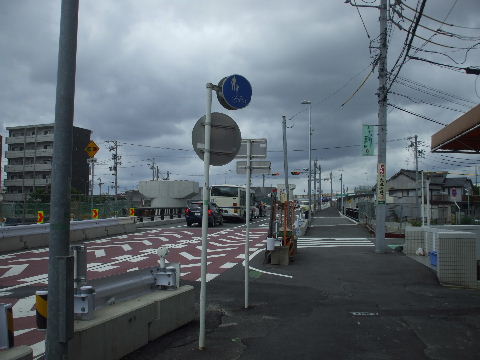| 2017年03月28日。側道へ入ると元三階橋南交差点の所で強制的に左折。この道で北へ行くにはこの先の交差点で黒川からの道に右折して入って行くことになる。上飯田から直に北へ行くのは立体車線の一車線だけ。 |
