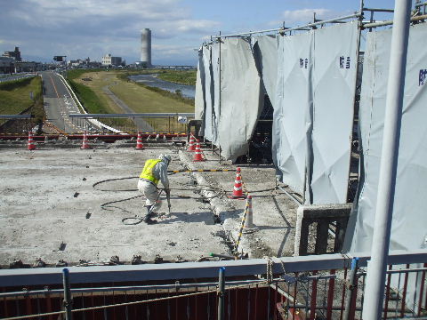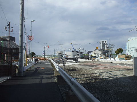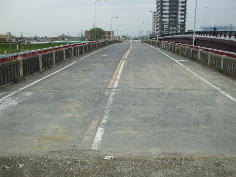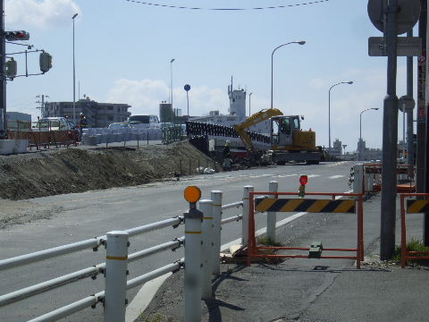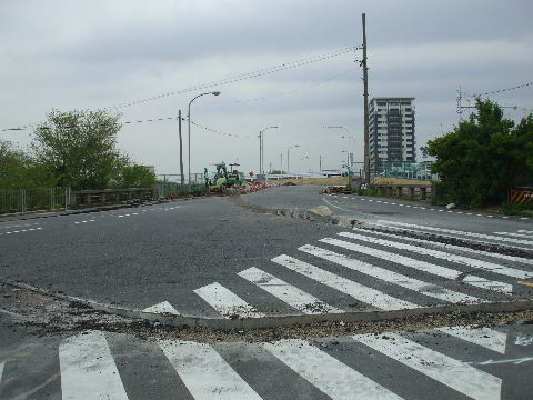 | 2011年4月30日。アスファルトが切り刻まれている。電柱や街灯などの撤去に続いて旧橋の撤去が行われるものと思われる。