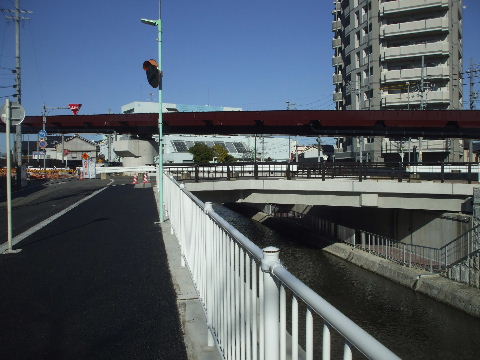 | 2017年12月24日。道路の下、庄内用水沿いに道路整備中。歩道は早くに開通している。東側から見る。手前が上飯田方向、奥が黒川方向の道路橋。 |