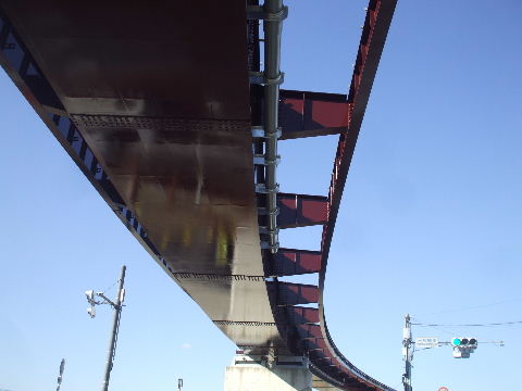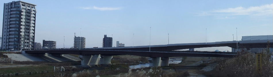 2016年12月18日。北から見る。今は南行き車線の橋を使っている ので大きくカーブしてくる。 |