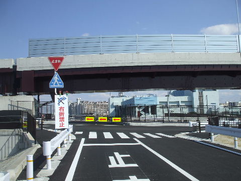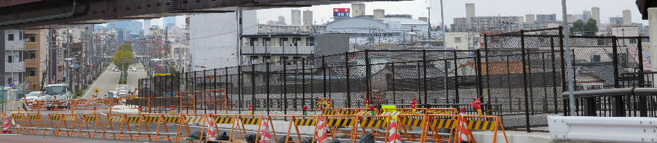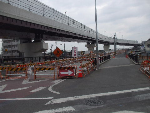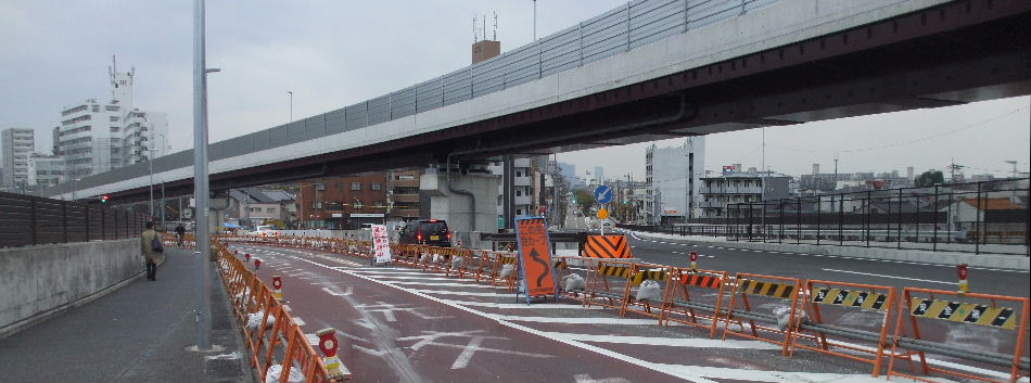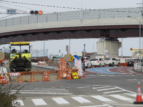 | 2017年03月28日。仕切って一車線だけにした下の車線と欄干の向こうの立体車線を下りてきた車線。 |