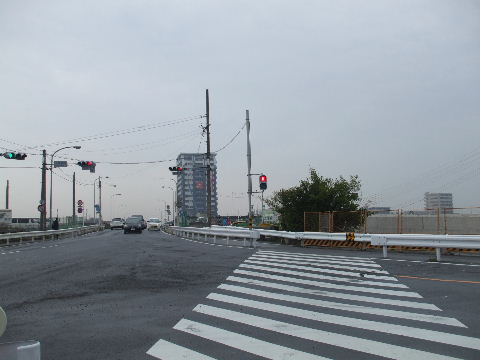 2017年03月28日。堤防道路の三階橋交差点も信号が無くなった。 橋の南北がこれでは歩行者は非常に不便。 |